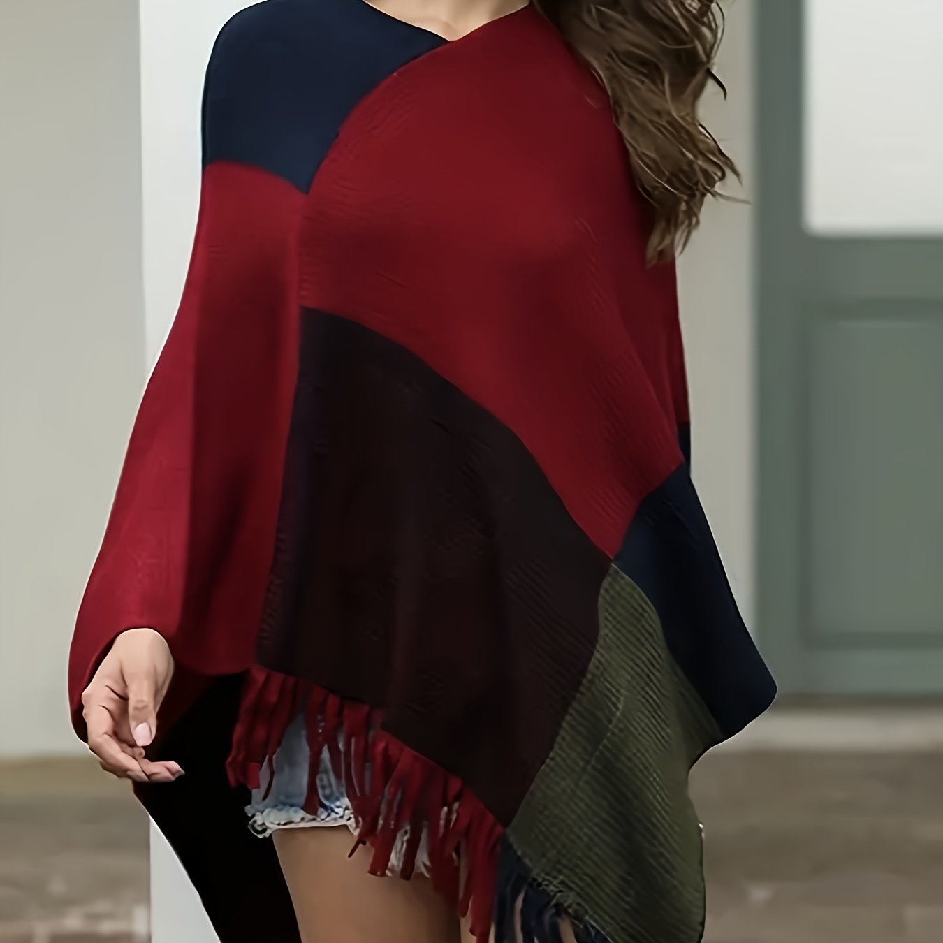 TEMU 플러스 사이즈 - 플러스 사이즈 가을/겨울 스타일리시 컬러 블로킹 풀오버 배트윙 스웨터 코트 여성용, 케이프 숄.