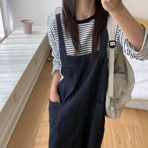 [옷자락] 여자 키치무드 루즈핏 사각패치 멜빵 데님 롱 원피스