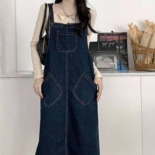 [에이치플러스몰]청 멜빵 원피스 여자 데님 롱스커트 캐주얼 빈티지 데일리 꾸안꾸 스트릿 유니크 여름 ..