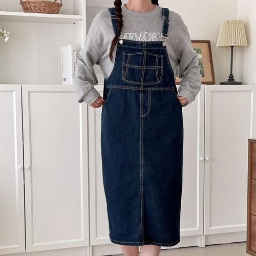 [SBD] 롱 언발란스 여성용 멜빵 원피스 데님 캐주얼 스타일 스커트