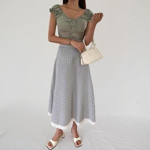 [옷자락]여성 면혼합 미세 체크 레이스 밑단 A라인 롱 스커트