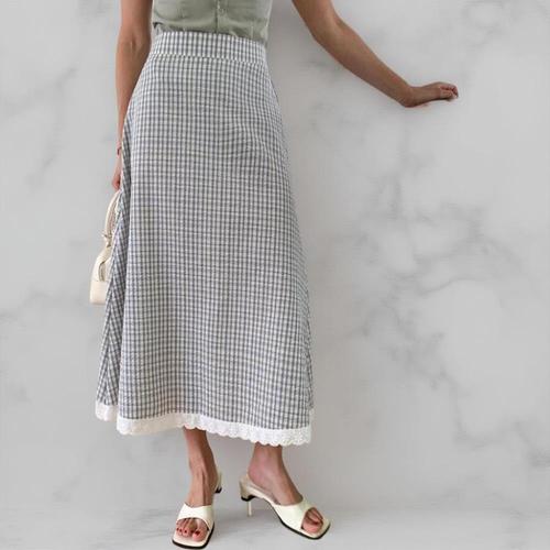 [신상오픈런]여성 체크 패턴 레이스 A라인 롱 스커트 면혼합