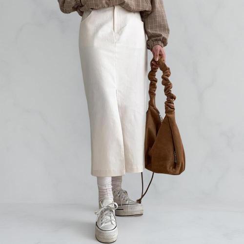 [큐즈샵] 여성 H라인 면 롱 스커트 허리 뒷 밴드 밑단 뒷트임 오피스룩 하객룩 빅사이즈