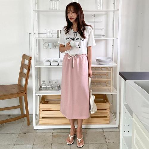 여자 여름 코튼 레터링 반팔 티셔츠 롱스커트 세트