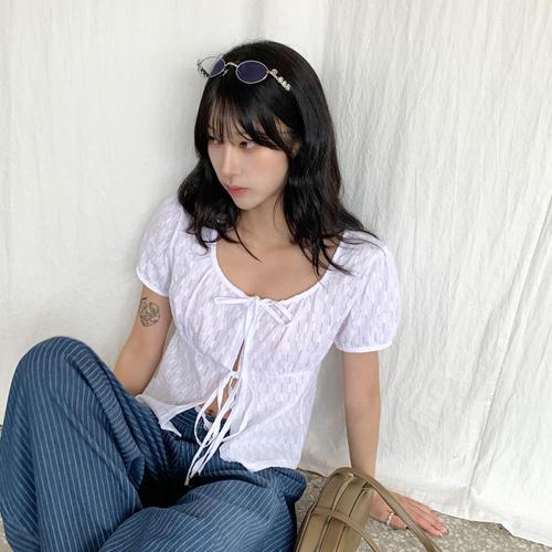 여성 면원단 리본 스트랩 슬릿 반소매 블라우스