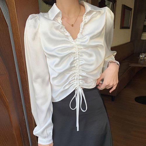 [셀럽하우스]셔링 EOFM6444 크롭 면접블라우스 옆지퍼 볼륨 블라우스 바스트