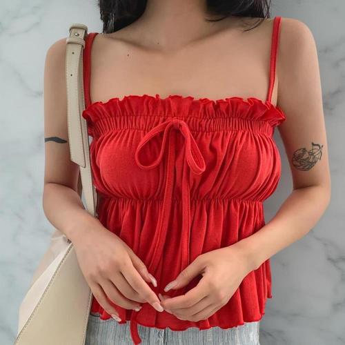 [다잇템]여성 면혼합 스트랩 잔주름 슬리브리스 리본 탑