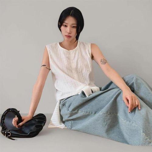 [신상오픈런]여성 무지 면 줄무늬 펀칭 라운드넥 민소매 블라우스
