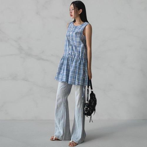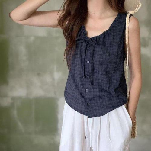 [신상오픈런]여성 체크 민소매 블라우스 코튼 레이온 셔링 스트랩