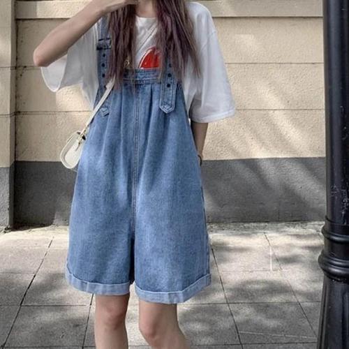 [옷자락]여성 캐주얼 면혼방 롤업 데님 점프수트 반바지