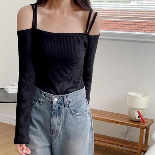 [신상오픈런]|KST5BF6|스레딘 잔골지 긴팔티 슬림핏 슬릿 모달 여성 오프숄더_18175395_597559