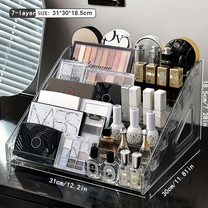 TEMU 1개 화장품 보관대, 뷰티 디스플레이 랙, 다기능 데스크탑 수납함, 7단 계단형 수납 랙 포함, 욕실 수납, 침실 수납, 데스크탑 수납, 화장대 수납, 투명 플라스틱|화장대