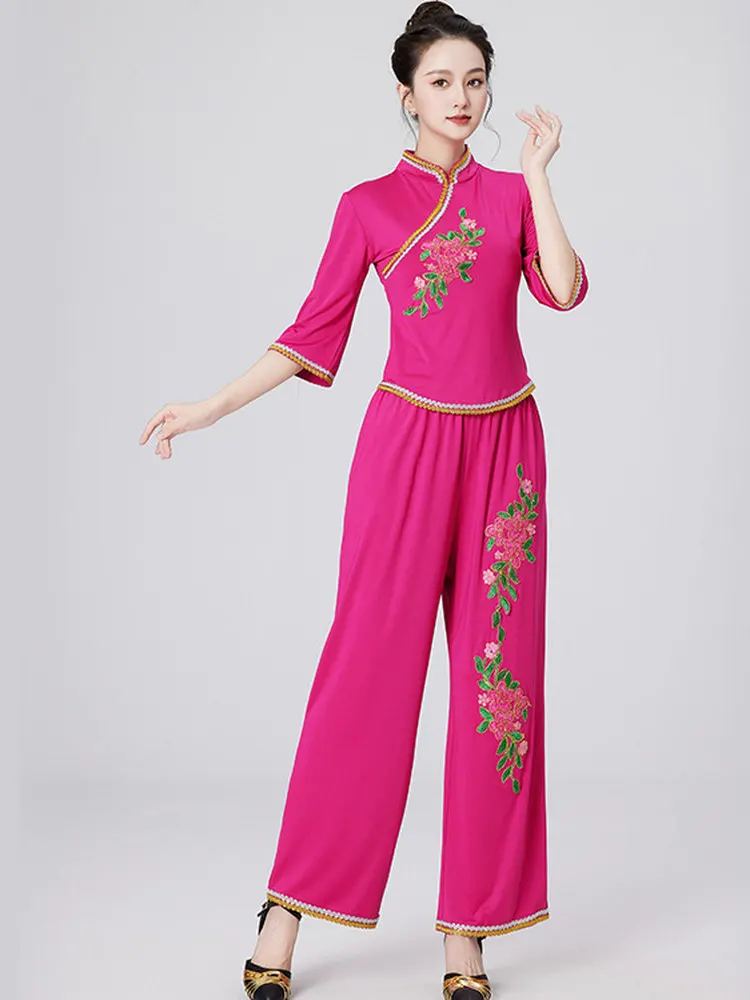 스퀘어 댄스 의상 여성 벨 슬리브 스탠드 칼라 민속 무용복 공연 드레스 슬림핏 밀크 실크 7부 소매