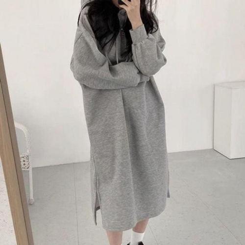 따숩 기모 후드 트임 맨투맨 롱 원피스