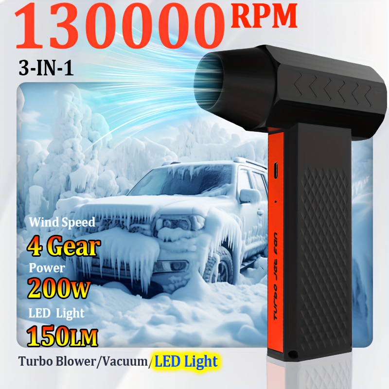 TEMU 130000RPM 휴대용 에어 블로워 (조명 포함) - 200W 고출력, 4단 속도 조절, USB 충전식 배터리, ABS 재질, 차량용 제설기, 낙엽 제거기, 컴퓨터 청소, 야외 캠핑 및 차량 후방 거울 물방울 클리너로 적합, 에어건청소기, 터보제트송풍기, 차량용 선풍기, 무선송풍기 초강력, 미니송풍기, 엔진, 에어건 초강력 무선