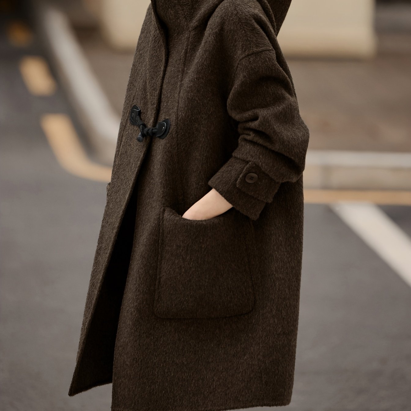 TEMU XWI 여성용 신상 봄/여름 코트, 후드형 노치 라펄 미디엄 기장 수제 양면 울 코트, 가을/겨울용 캐주얼 출퇴근용 트위드 코트