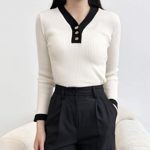 [모노무드]LMO 단추 컬러믹스실루엣 포커스 여성용 V라인 니트립 스탠다드 뜨개탑
