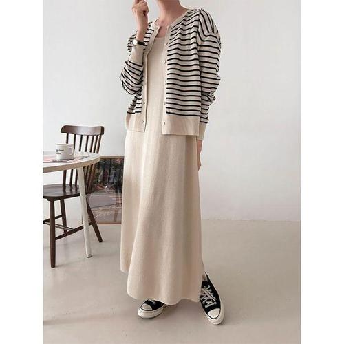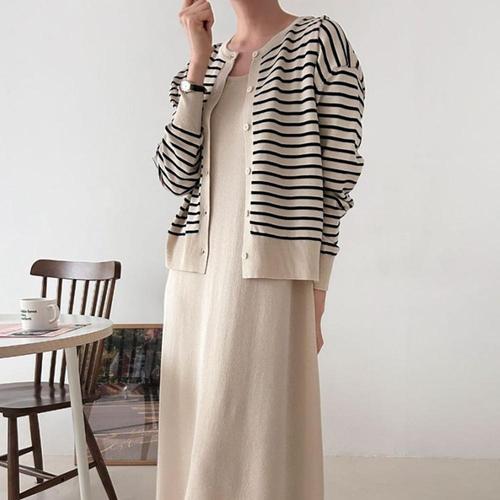 [샵앤][샵앤] 여성 라운드 민소매 원피스 단가라 긴팔 가디건 세트 ARA-WSET-4859-크림
