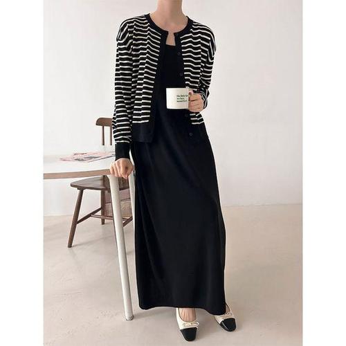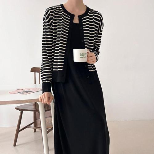 [샵앤][샵앤] 여성 라운드 민소매 원피스 단가라 긴팔 가디건 세트 ARA-WSET-4859-블랙