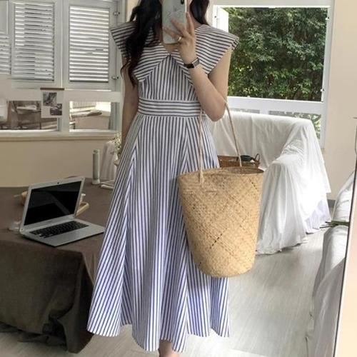 해피유통 여성 웨이브 일자 스트라이프 날씬해 보이는 미디기장 나시 원피스 gdwx