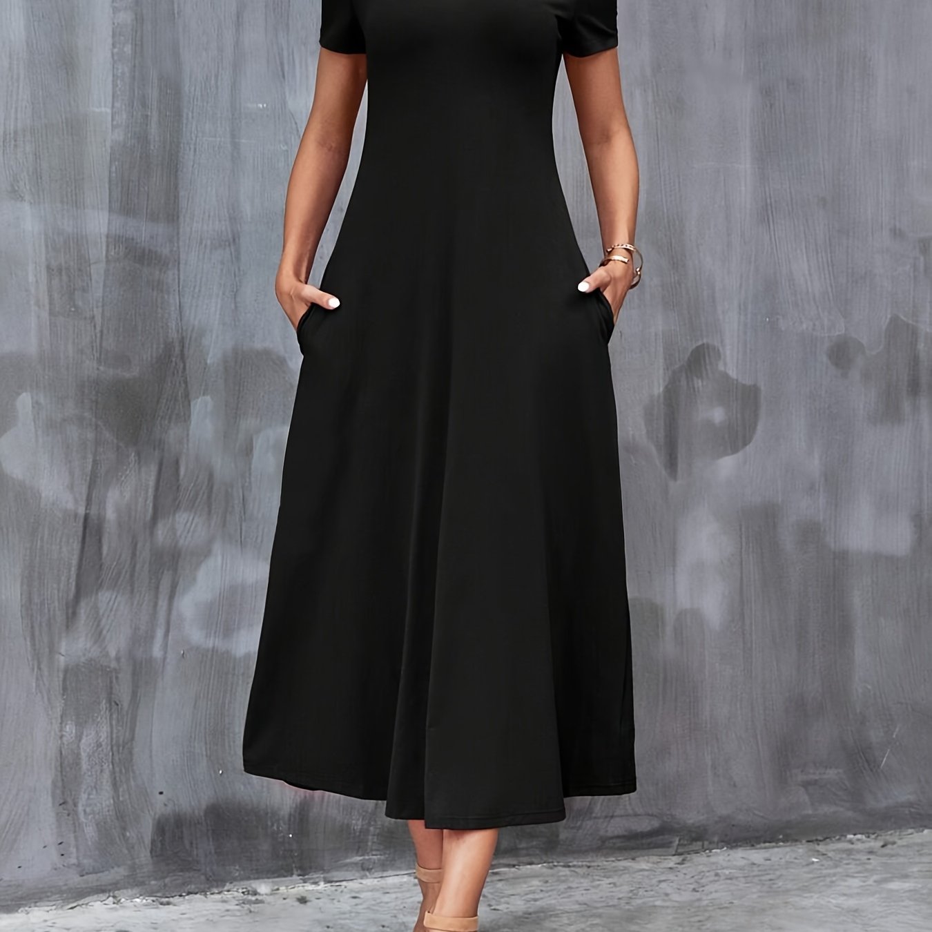TEMU 여성용 캐주얼 V넥 반팔 A라인 포켓 드레스 - 단색, 중간 신축성, 세탁기 사용 가능, 사계절 내내 편안한 착용감 & 반공식 행사용, 휴가 의상, 우아한 스타일, 여행용 패션