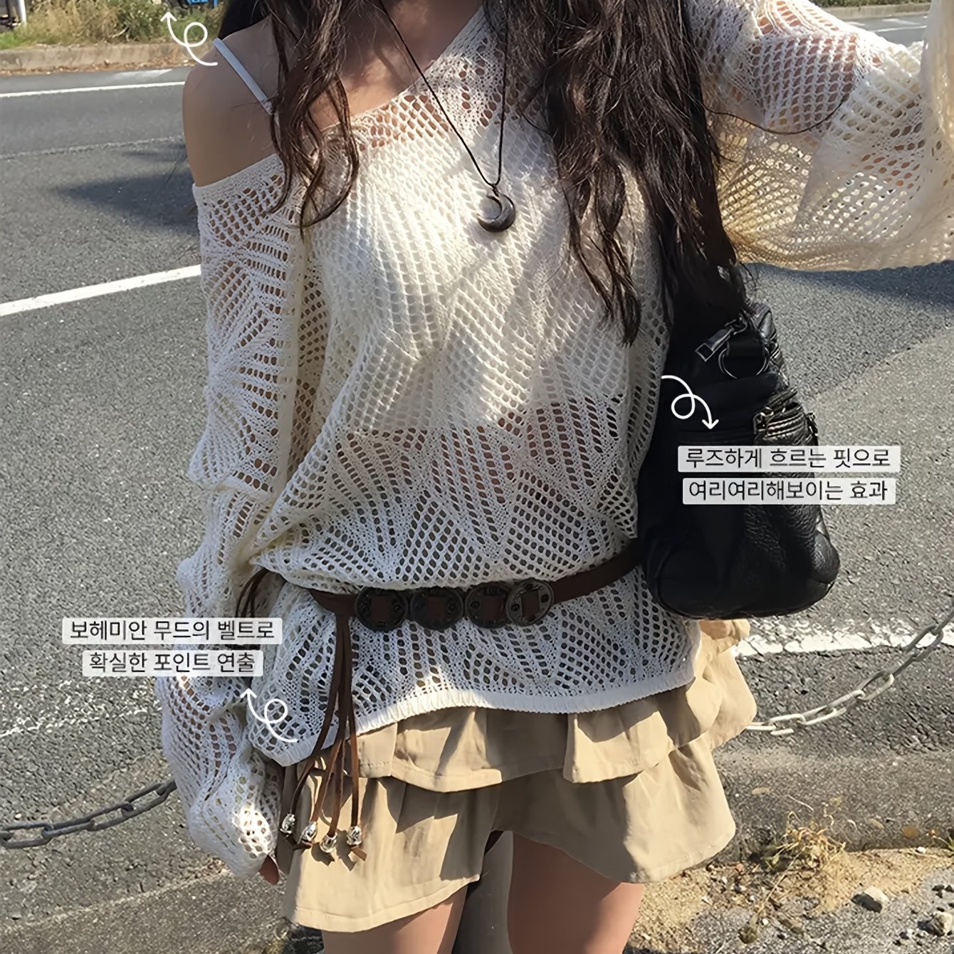 TEMU 인스타 스타일 오픈숄더 스웨터, 루즈하고 여유로운 핏, 벨트 액세서리 없음, 새로운 봄/여름 스타일, 오픈워크, 활용도 높은, 디자인 중심, 캐주얼, 긴소매 상의