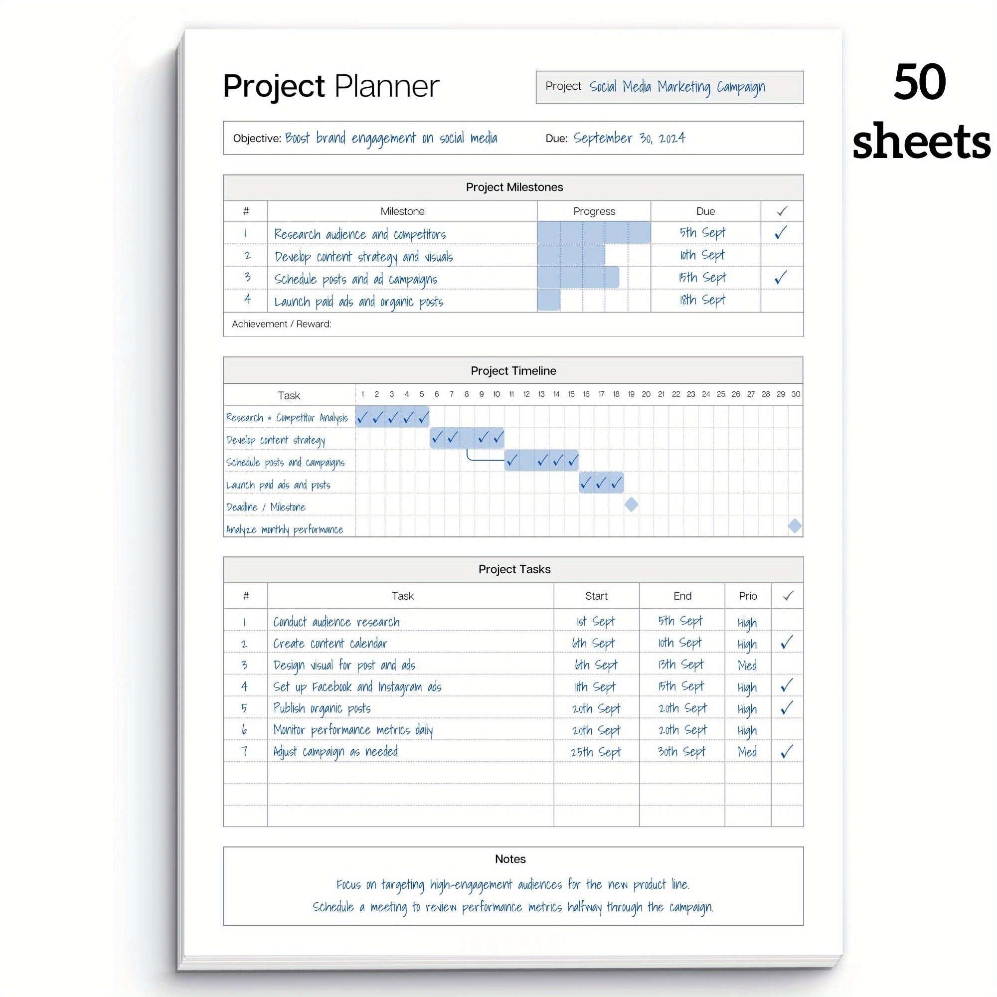 TEMU 1개 플래너 / 프로젝트 추적 플래너 / 시간 진행률 추적 플래너 / 50페이지 찢어서 분리형 플래너 / 자기 계획가, 플래너, 자기 관리자, 개인 정리사용