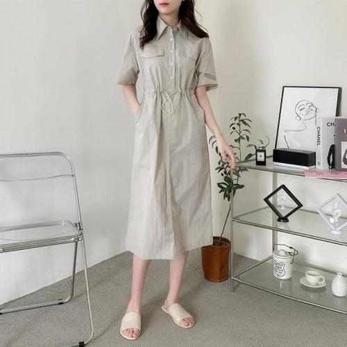 [다잇템][다잇템] 여자 카라 반소매 버튼 롱 허리 드로우코드 바스락 원피스_12926229_588872