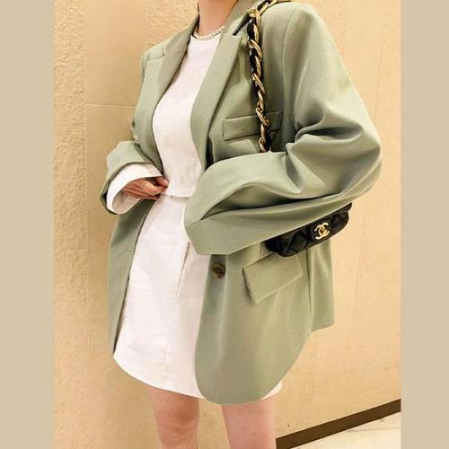 [바이어스]뒷 트임 리본 테잎 카라 긴팔 스판 더블 자켓 코디 룩 (18642577)