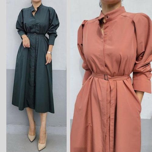 [바이어스]노카라 차이나넥 벨트 세트 트렌치 플레어 롱 원피스 (18642605)