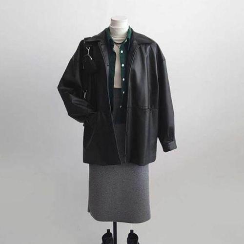 [에이치플러스몰]여성 레더 재킷 카라넥 오버핏 바이크 아우터 가죽자켓