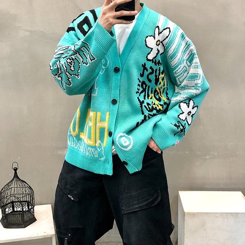 맨스토리 / 박스 그래피티 플라워 레터링 배색 남자 봄 오버핏 니트 가디건