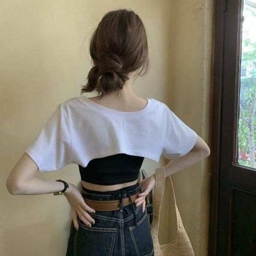 [에이치플러스몰]레이어드 핫크롭 박스티 여유핏 반팔 크롭 티셔츠