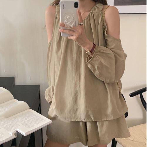 어깨트임 긴팔 블라우스 숏팬츠 반바지 투피스 세트 WFLX6HC