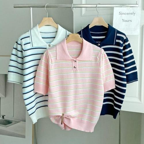 [다잇템]여자 폼폼 카라넥 반소매 줄무늬 니트 (32540934A)