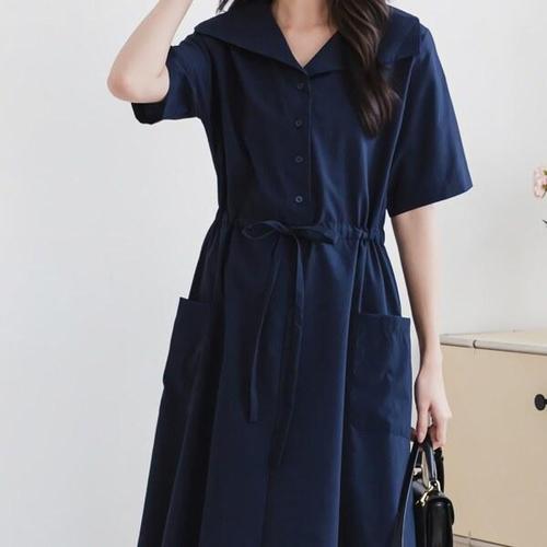 [리빌모아]여름 여자 심플 배색 카라 롱 반팔 원피스 SDW-OPH-SJSC1002152