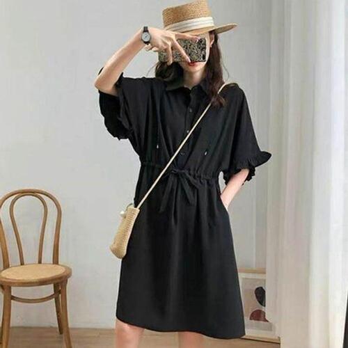 [신상오픈런]여성 카라넥 반팔 원피스 허리 조절 가능한 롱 셔츠 드레스