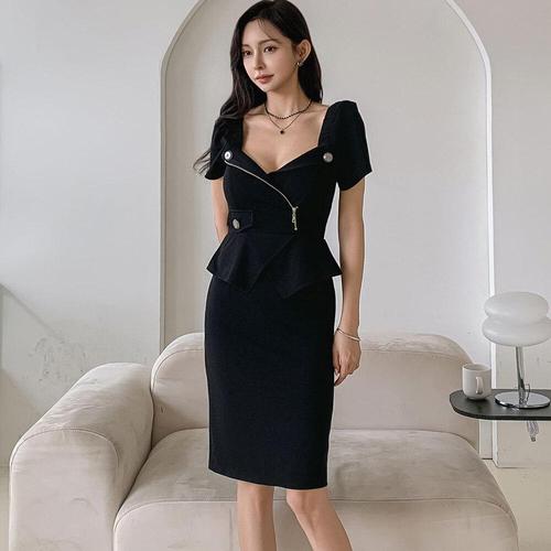[셀러허브_여성트랜드패션]ONM 여성 니트원피스 트임 카라 브이넥 블랙 반팔 미