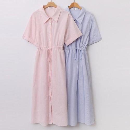[미라클세븐]여성 카라넥 반팔 원피스 허리 조절 가능한 롱 셔츠 드레스
