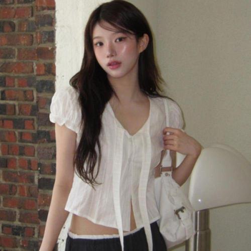 [오너클랜]인기상품 리본 장식 퍼프 여성용 반팔 블라우스 티셔츠 [WFLLIP2_260305]