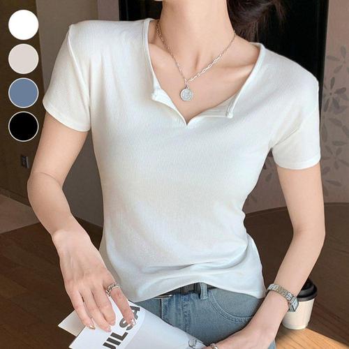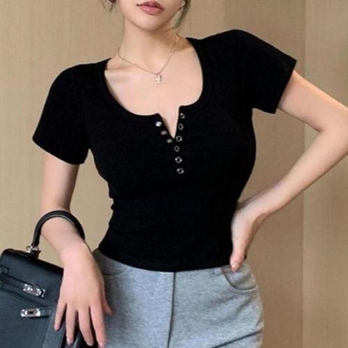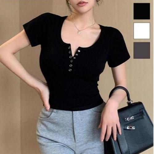 [셀러허브_여성트랜드패션]여름 슬림핏 글램핏 슬림핏티셔츠 반팔티셔츠 3컬러 크롭 단추 여름티셔츠