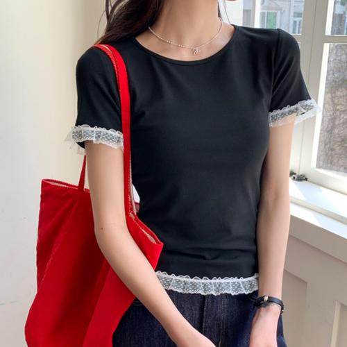 [셀럽하우스]레이스 GZJB0411 포인트 슬림핏 반팔티셔츠 여성 여름 러블리