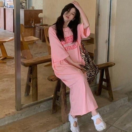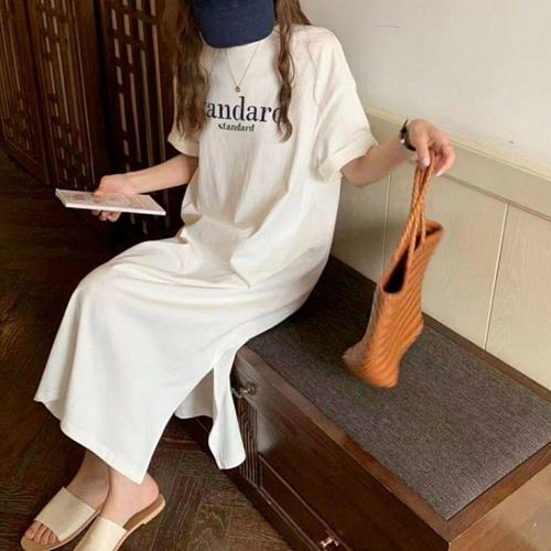 플러스 사이즈 캐주얼 티셔츠 원피스 여성 여름 루즈핏 하이웨이스트 반팔 라운드넥 롱 원피스 한국 버전