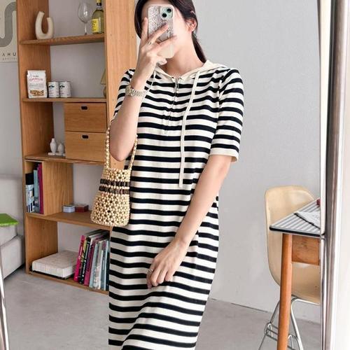 [다잇템]여자 반소매 줄무늬 하프집업 롱원피스 (15249230A)