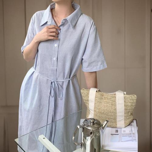 |CMO55FC|여성용 스트라이프 허리 조절 반팔 롱 드레스 면혼합 원피스