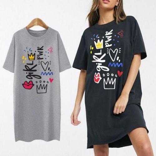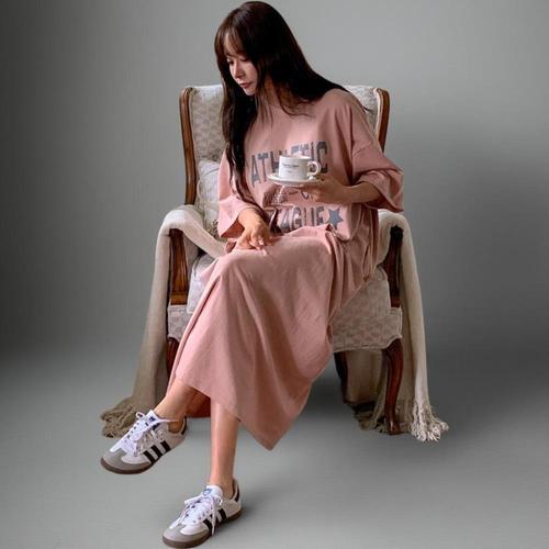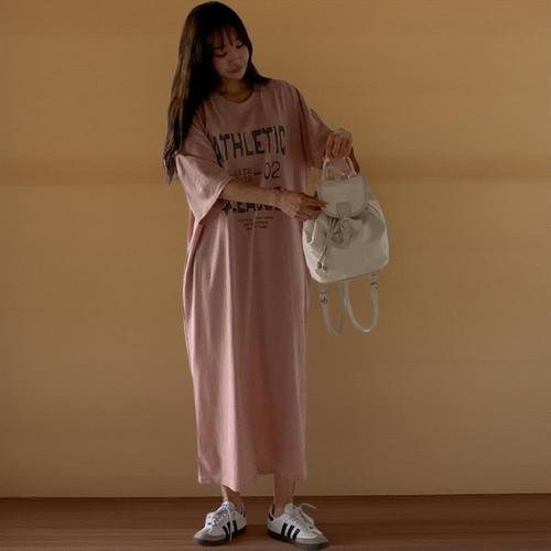 |KHO55D5|여성용 루즈핏 반팔 코튼 롱 원피스 레터링 디자인