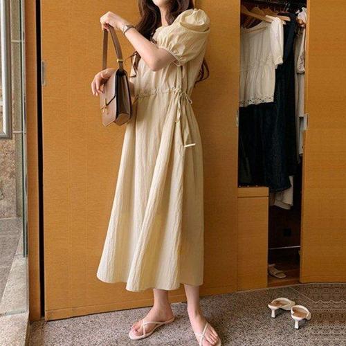 [신상오픈런]여자 러블리 무지 코튼 퍼프 반팔 플레어 롱 원피스