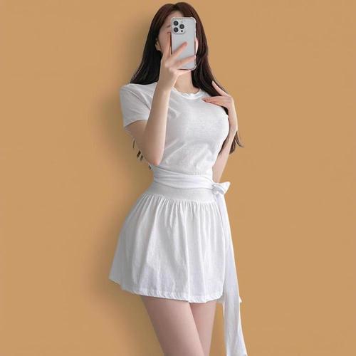 |KCO5710|여성 심플한 코튼 허리 리본 미니 반팔 원피스