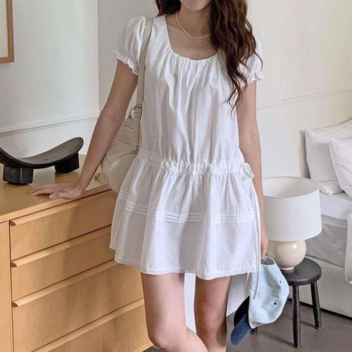 [옷자락] 여성 아이보리 코튼 퍼프 셔링 미니 반팔 원피스
