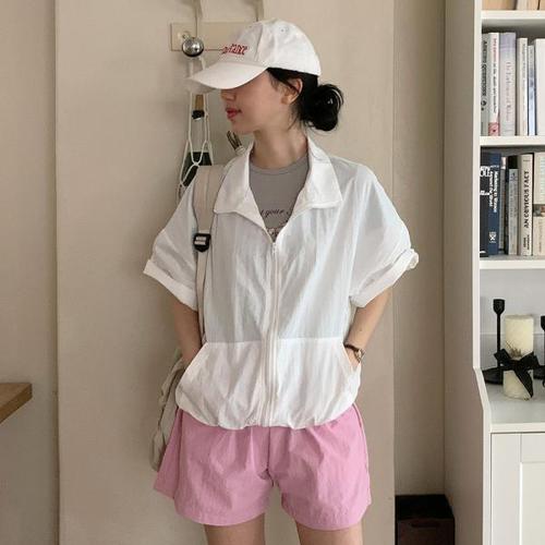 [다잇템][다잇템] 여자 카라없는 집업 윈드브레이커 SS 나일론 반소매 자켓_17862688_588872
